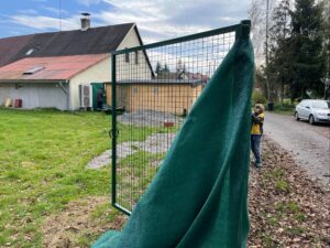Prodloužený, neprodloužený, hlavně že je hezky! Vrhli jsme se tedy na dokončení hotového plotu, který jsme chtěli opět potáhnout suknem. Hafani tak nevidí ze zahrady, čímž zamezíme jejich štěkání, třeba i na padající listí ze stromu. A osvědčilo se nám to hned první den!